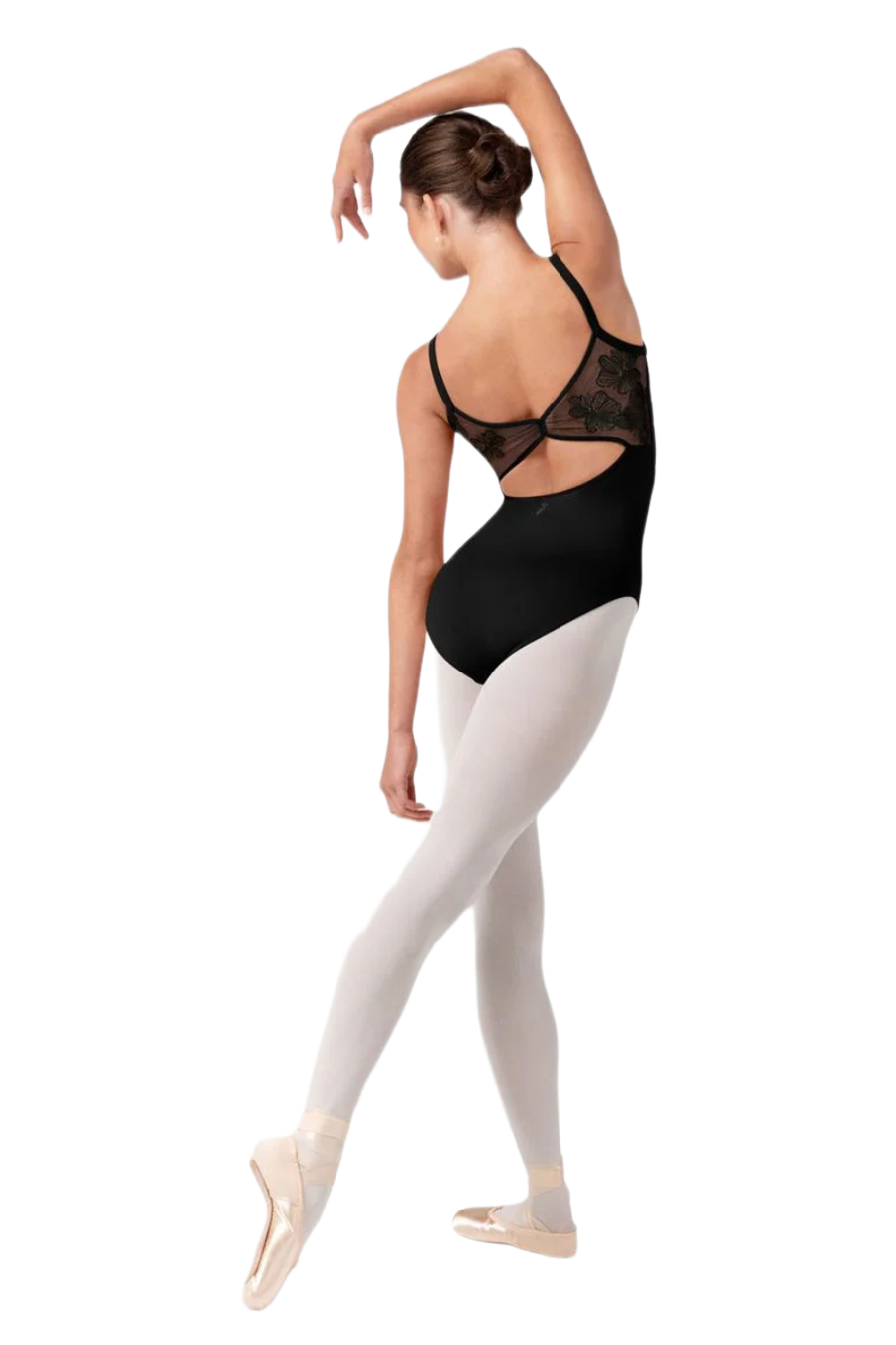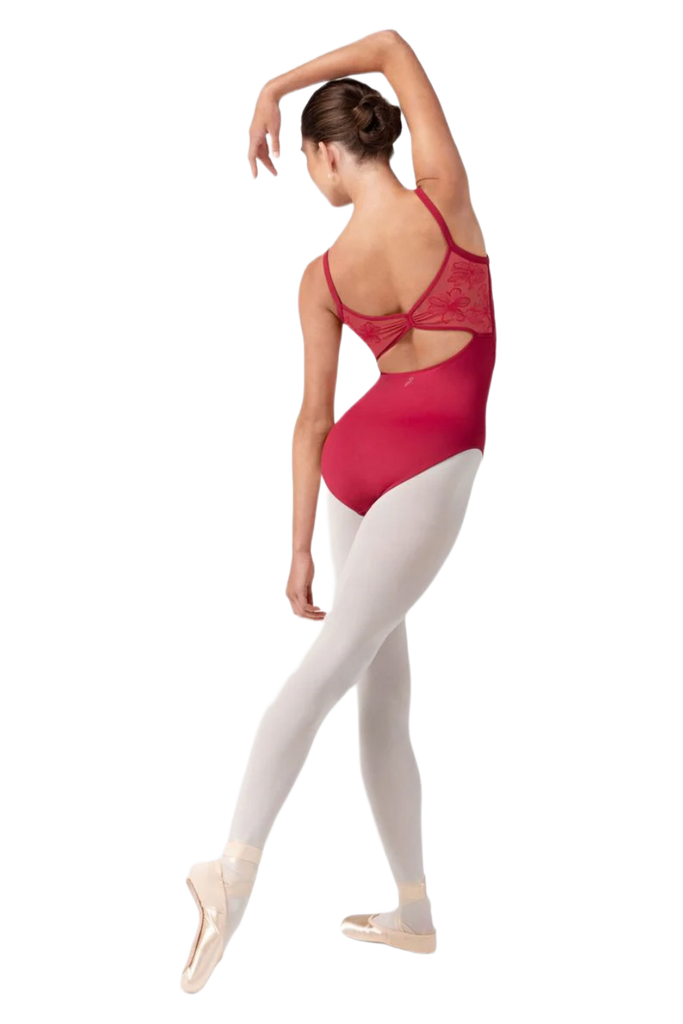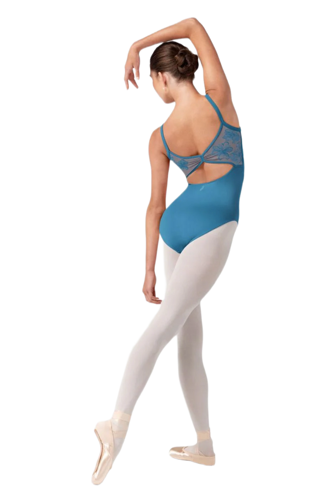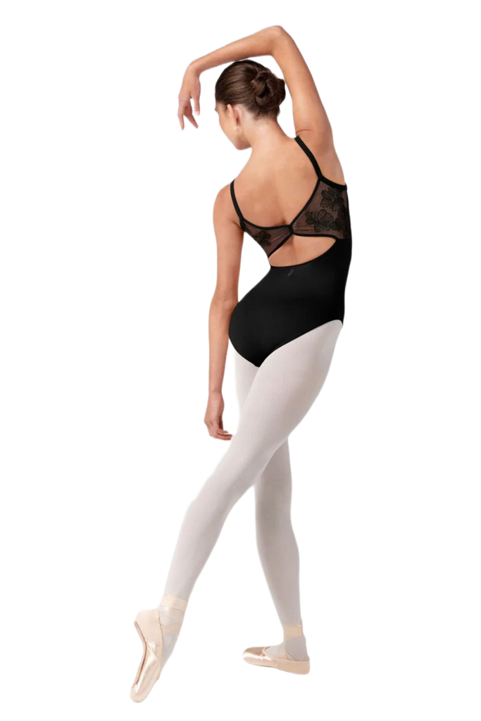 O collant Lorelei apresenta um delicado decote arredondado com painel em tule transparente, alças finas estilo camisole e um sofisticado detalhe bordado nas costas em tule.