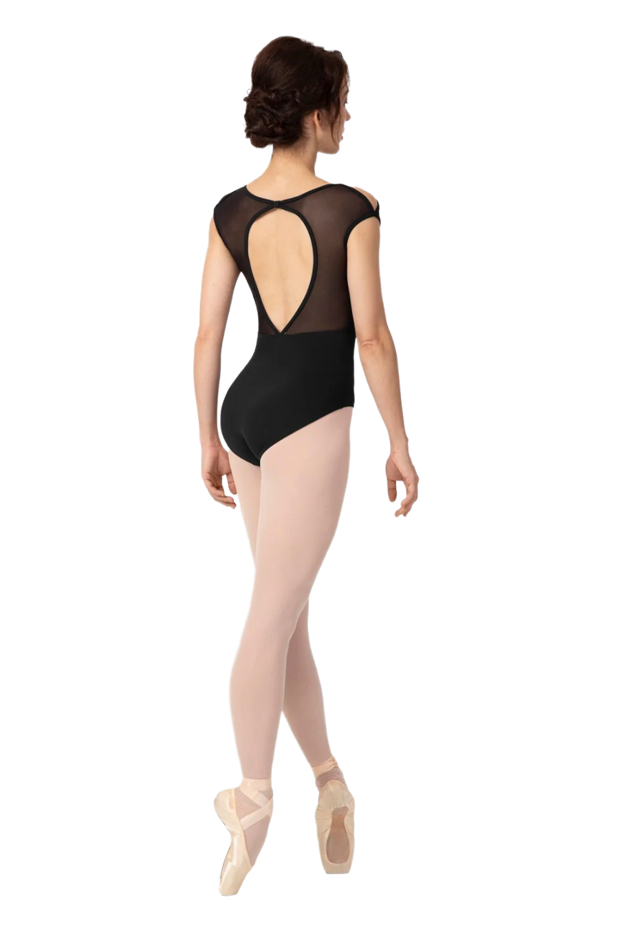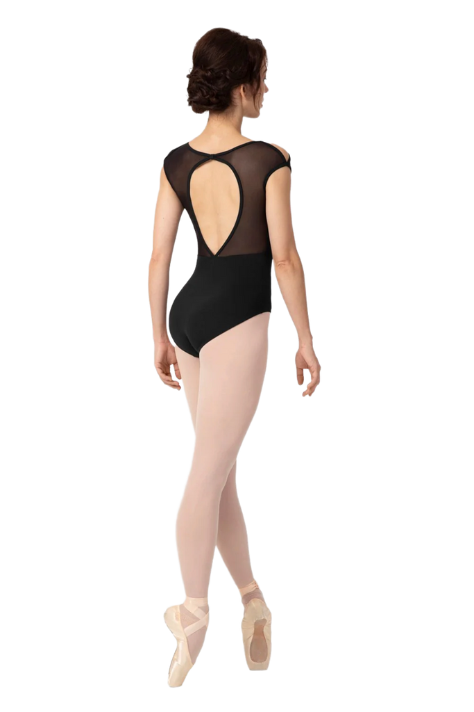 Este elegante collant da linha Boutique apresenta decote V em tule com detalhe em formato coração e costas abertas com fechamento atrás do pescoço.