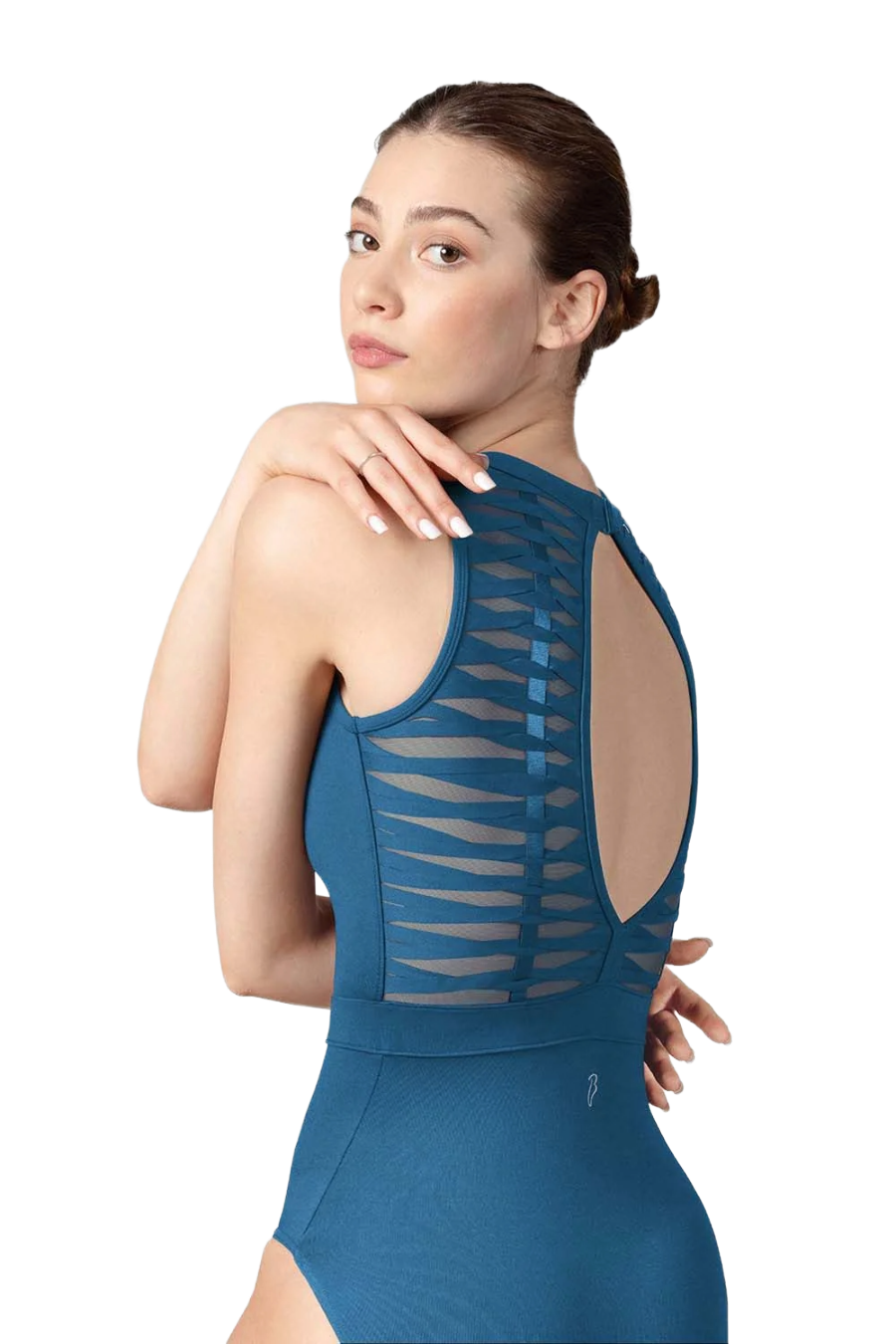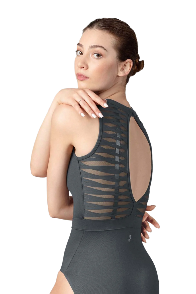 O collant Leony combina sofisticação e modernidade com um design marcante. Suas costas abertas são emolduradas por painéis em tule torcido, enquanto a gola alta com detalhe em formato coração adiciona um toque de elegância.