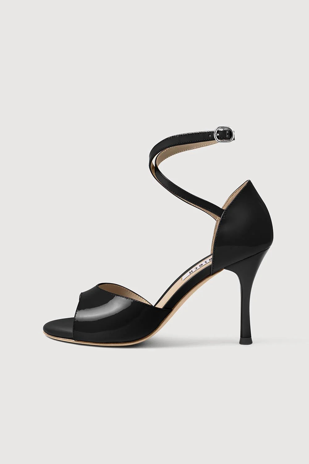 Confeccionado em couro envernizado de alto brilho, esse sapato de tango argentino apresenta uma tira assimétrica em espiral no tornozelo, oferecendo segurança e um visual escultural.