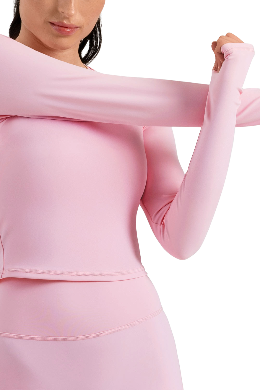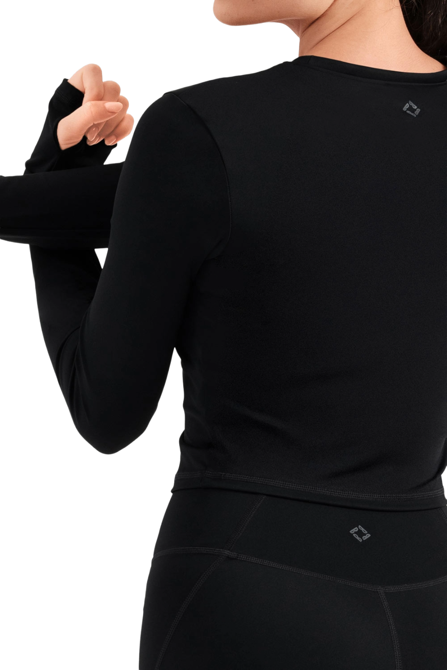 Com ajuste slim e tecido elástico, ela valoriza a silhueta sem perder o conforto. O decote arredondado alto traz elegância, enquanto as mangas longas com aberturas para os polegares oferecem praticidade e estilo moderno.