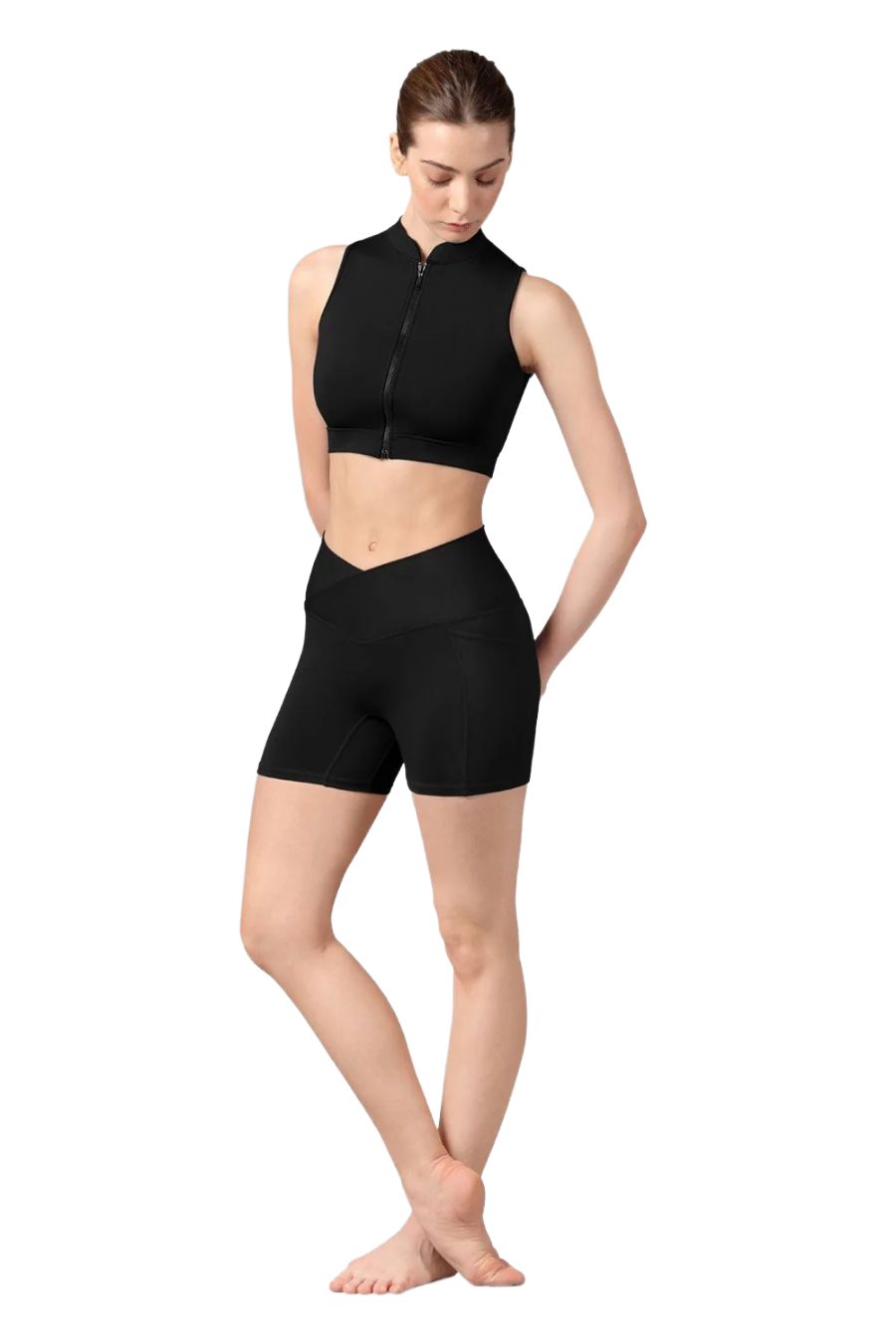 Os nossos shorts femininos Harrieta com cós em V frontal apresentam uma faixa larga em formato V na cintura, bolsos laterais duplos e comprimento funcional. Combine com nosso top cropped Alix com zíper frontal ou com o top cropped Catherine estilo camisole para compor o look perfeito de moda dança.