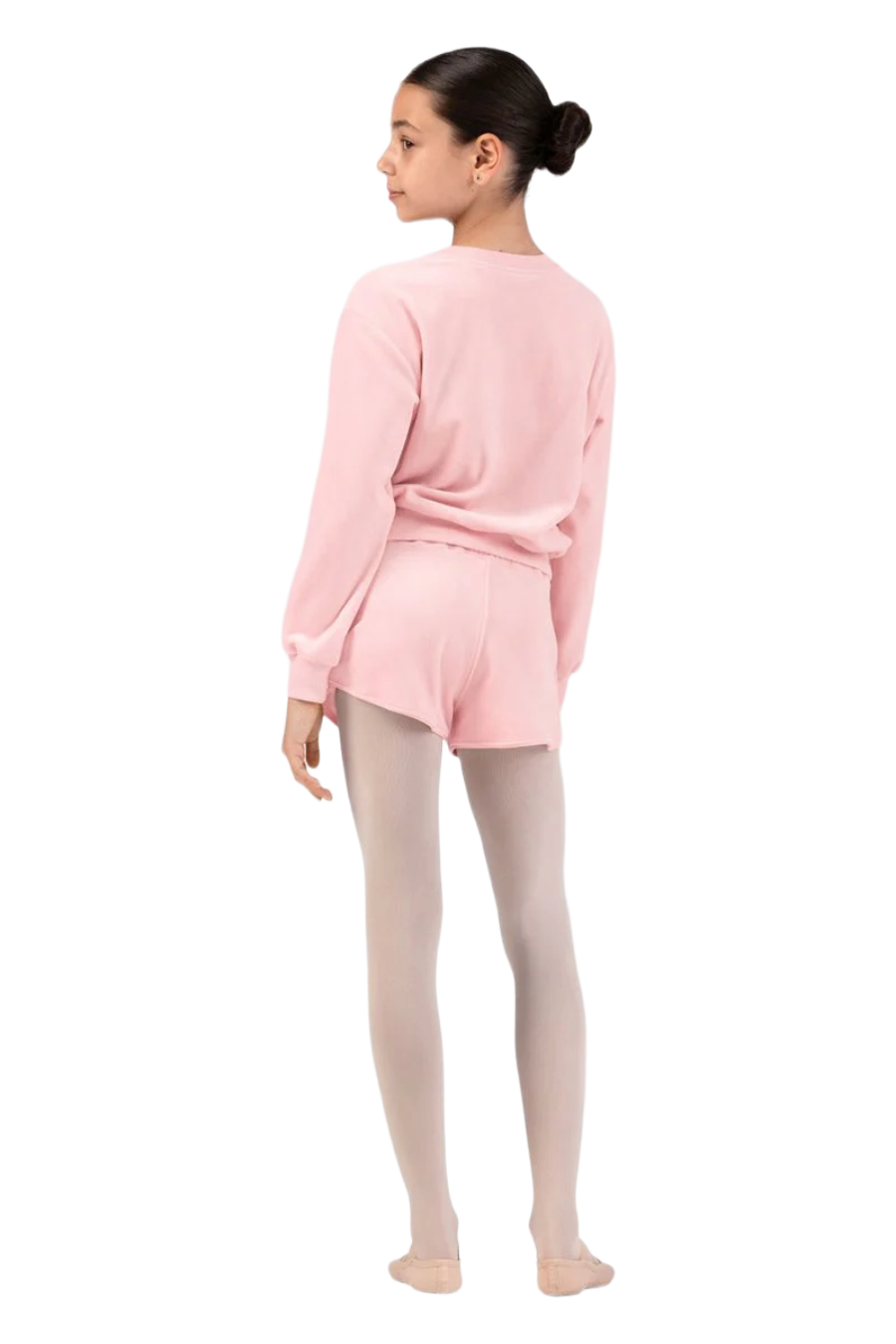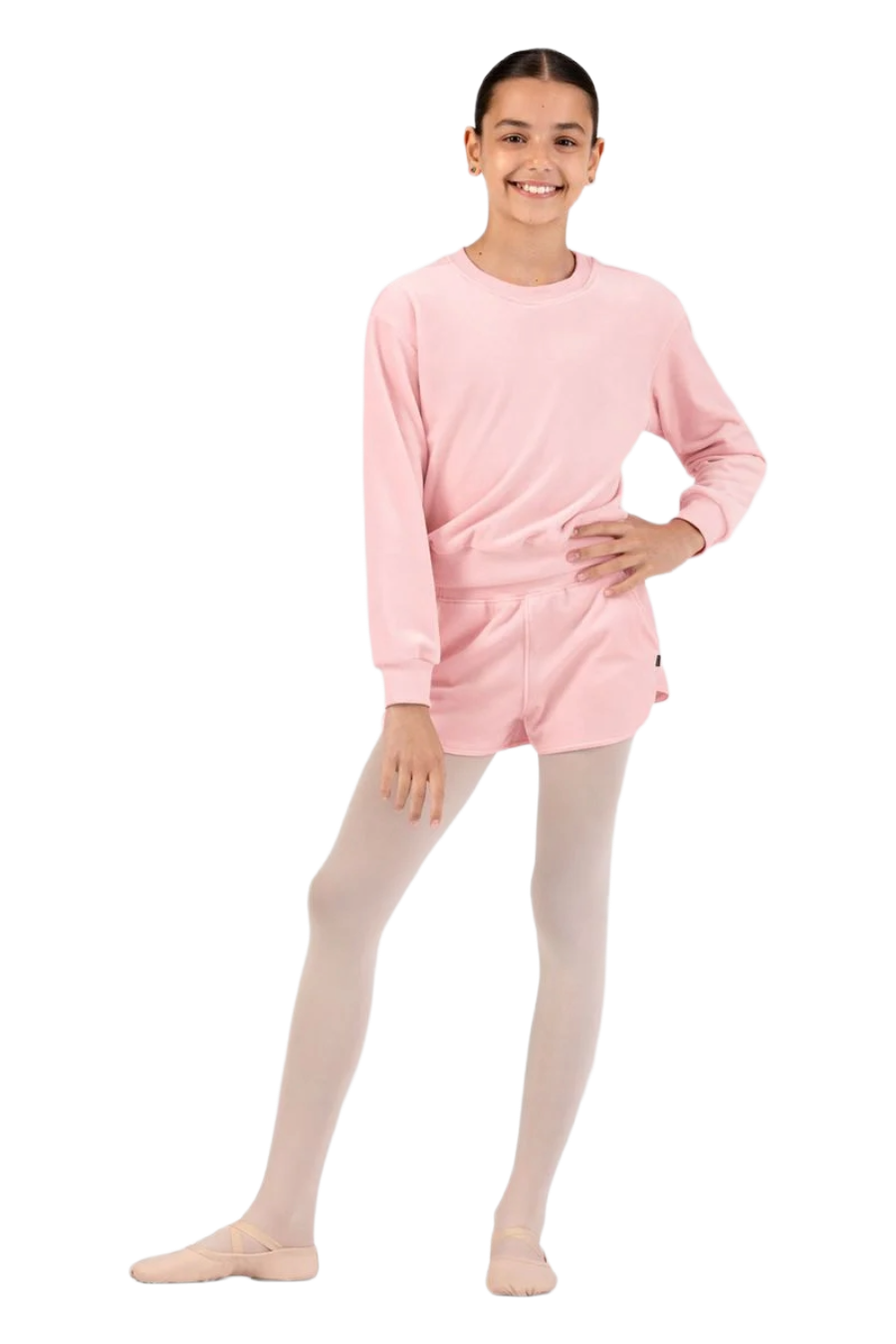 O Moletom Lily de Veludo para Meninas apresenta uma clássica gola careca, ombros caídos e punhos ajustados nas mangas e na barra, garantindo um caimento seguro e confortável. Ideal para ser usado sobre o collant favorito e manter o corpo aquecido durante as aulas.