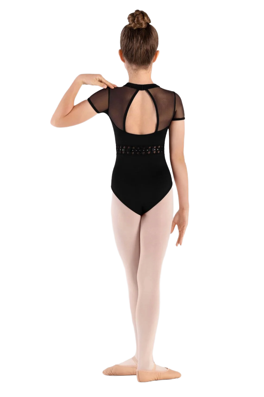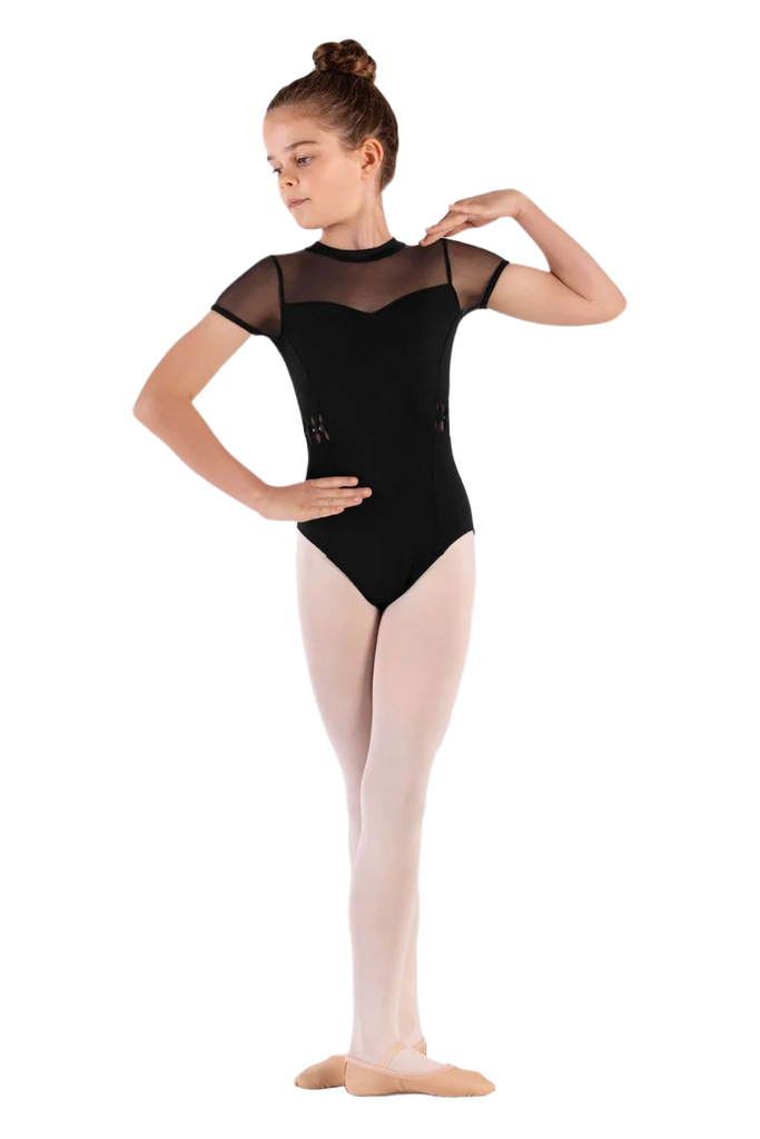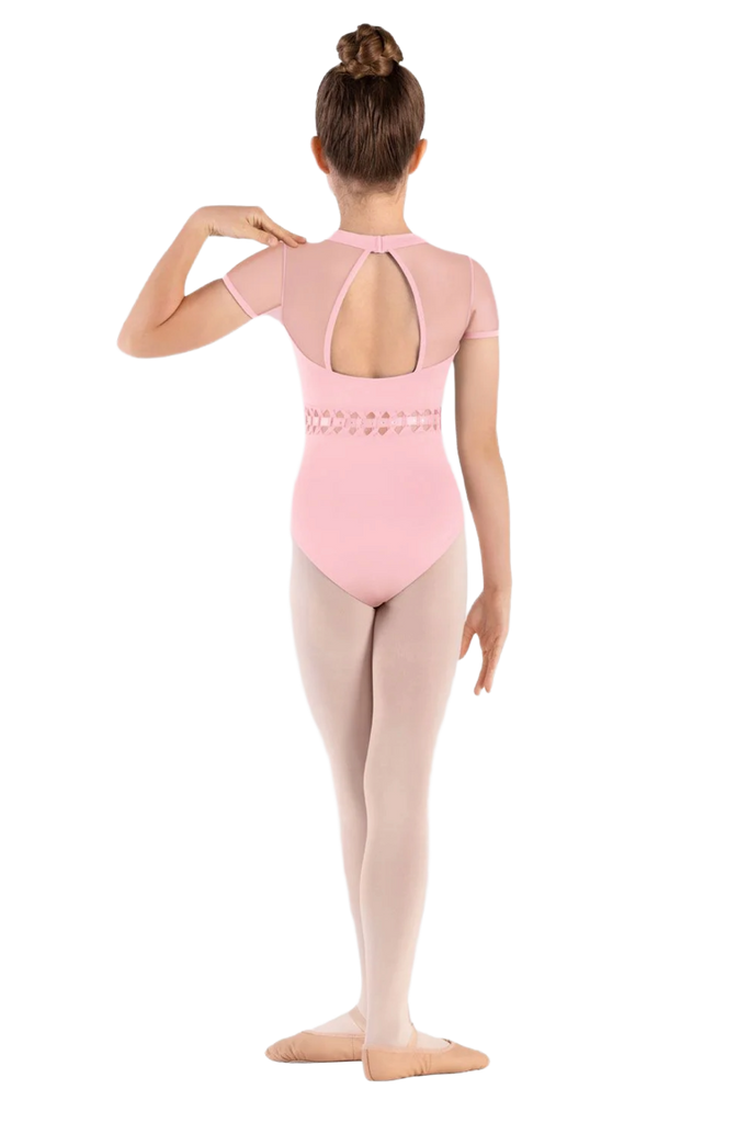 Nosso collant Meghan com mangas curtas para meninas apresenta uma gola alta com detalhe em tule no estilo coração, mangas curtas em tule suave e uma faixa entrelaçada com acabamento delicado. Criado para pequenas bailarinas que adoram girar, saltar e brilhar!